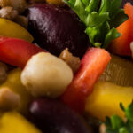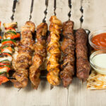 kebab is a common dish, consisting of a skewer with small pieces of meat or seafood, together with vegetables-
